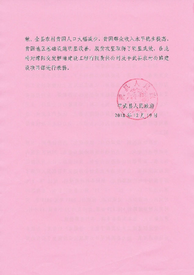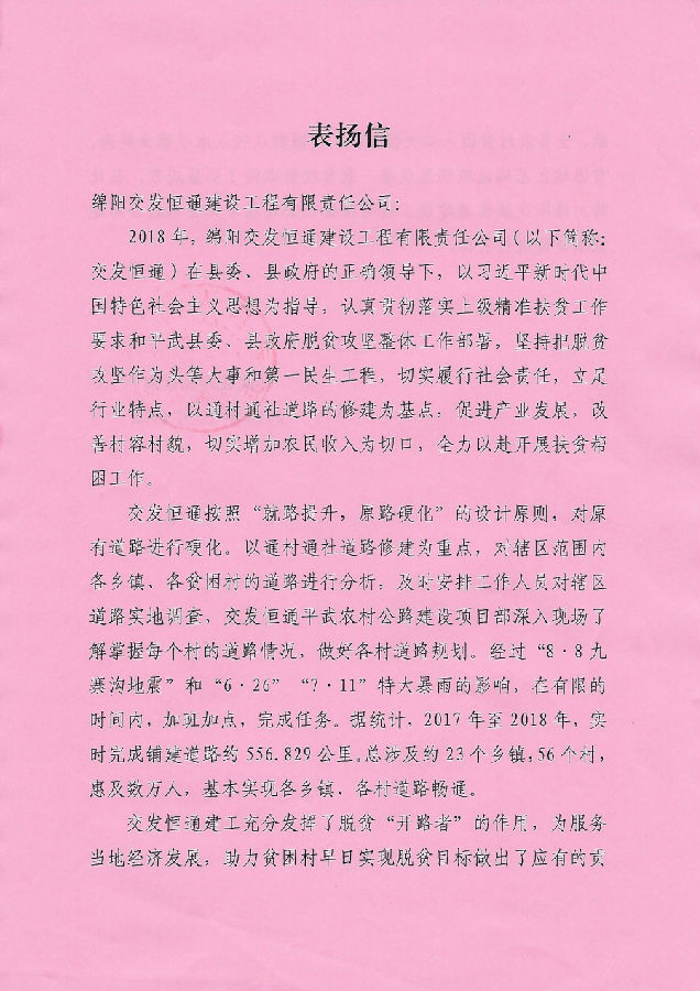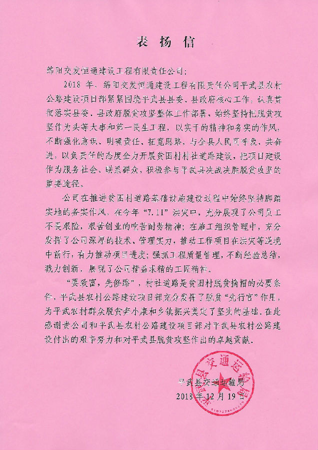 近日,恒通建工分別收到了來自平武縣人民政府和平武縣交通運輸局的兩封表揚信。信中對恒通建工在平武農(nóng)村公路項目實施過程中,以通村通社道路的修建為基點,促進產(chǎn)業(yè)發(fā)展,切實履行社會責任,充分發(fā)揮脫貧“開路者”和“先行官”的精神進行了表揚。特別是在今年“7.11”洪災(zāi)中,恒通建工攻堅克難、吃苦耐勞,推動項目在逆境中前行;強抓工程質(zhì)量管理,展現(xiàn)了精益求精的工匠精神;在有限的時間內(nèi),加班加點,已累計完成鋪建道路約556.829公里,總涉及約23個鄉(xiāng)鎮(zhèn),56個村,惠及數(shù)萬人,基本實現(xiàn)各鄉(xiāng)鎮(zhèn)、各村道路暢通,為平武農(nóng)村群眾脫貧奔小康和鄉(xiāng)鎮(zhèn)振興奠定了堅實的基礎(chǔ)。
