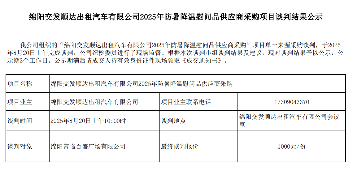 綿陽交發(fā)順達出租汽車有限公司2025年防暑降溫慰問品供應商采購項目談判結果公示