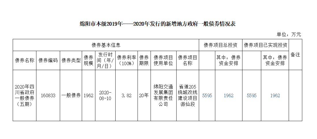 綿陽(yáng)交通發(fā)展集團(tuán)有限責(zé)任公司關(guān)于綿陽(yáng)市本級(jí)2019年——2020年發(fā)行的新增地方政府一般債券情況