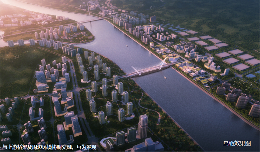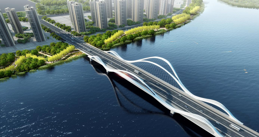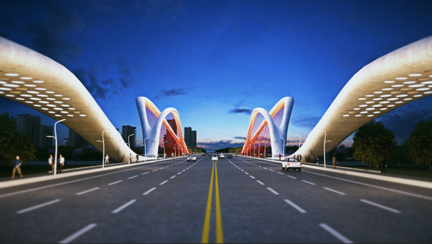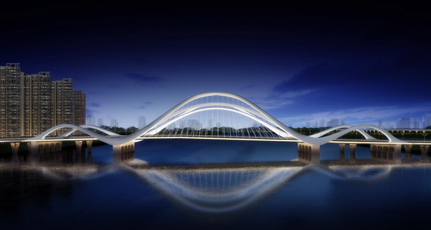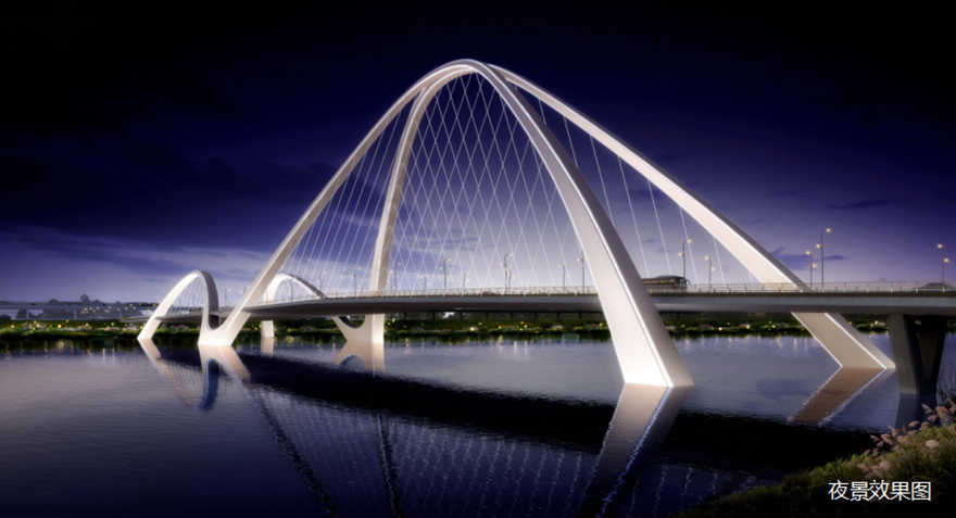 橋梁采用主橋300m下承式系桿拱橋。主拱拱肋具有雕塑感,模仿種子萌芽造型,搭配兩側(cè)小拱,形成眾星捧月之勢,寓意科技創(chuàng)新的萌芽,充分表達(dá)科技城的創(chuàng)新力、生命力。