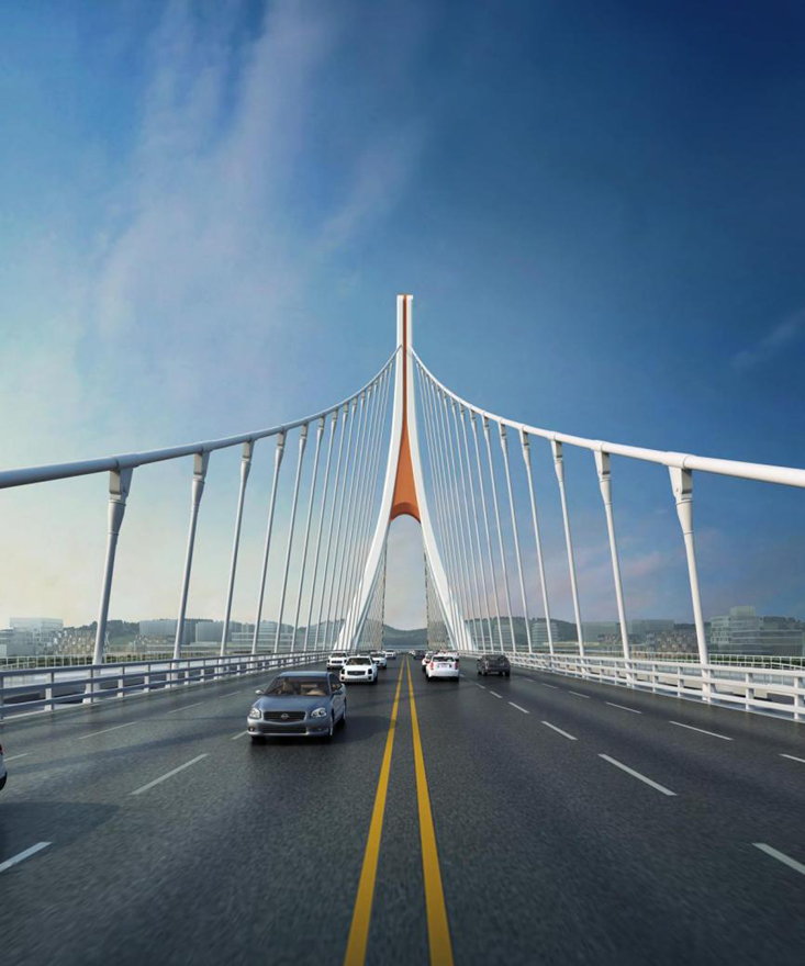 橋型采用主跨2×152m 空間索面斜拉橋。主塔似巨柱擎天,配合如禪意般的索面扭轉(zhuǎn)空間,猶如破水而出、蓄勢待飛的雕塑。