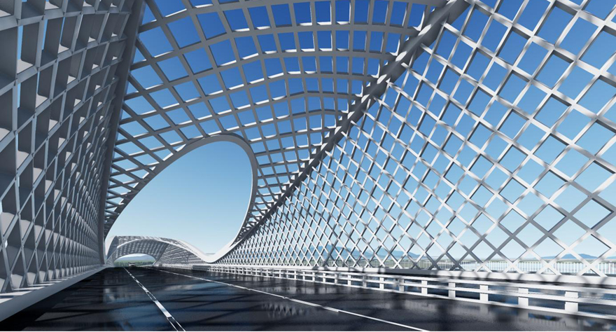 橋梁采用主跨180m 連續(xù)梁橋,橋面設(shè)置層次豐富的空間網(wǎng)狀構(gòu)架,造型設(shè)計新穎,猶如在時空之隧中穿梭,體現(xiàn)綿陽科技之城不斷探求未知世界、永攀科技高峰精神。